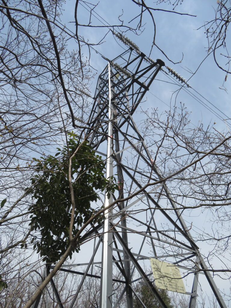 拓大西尾根を進むと、まずはJR鉄塔があらわれます。ここまで旧谷村線鉄塔の近くで見てきた送電線路の続きの鉄塔です。