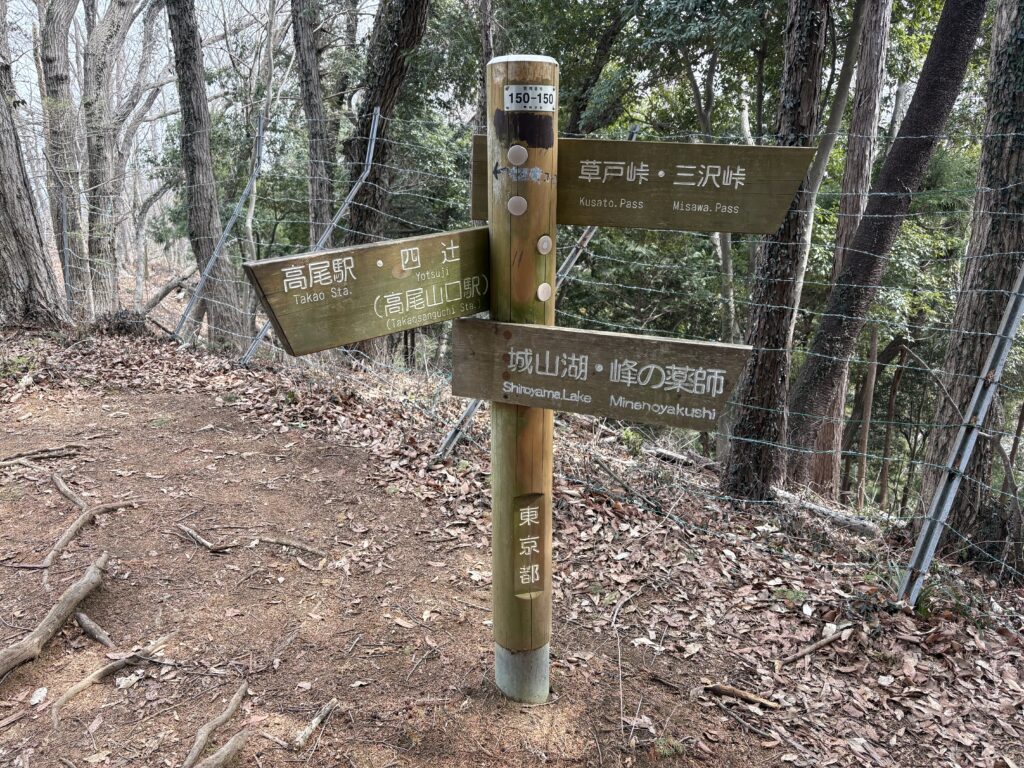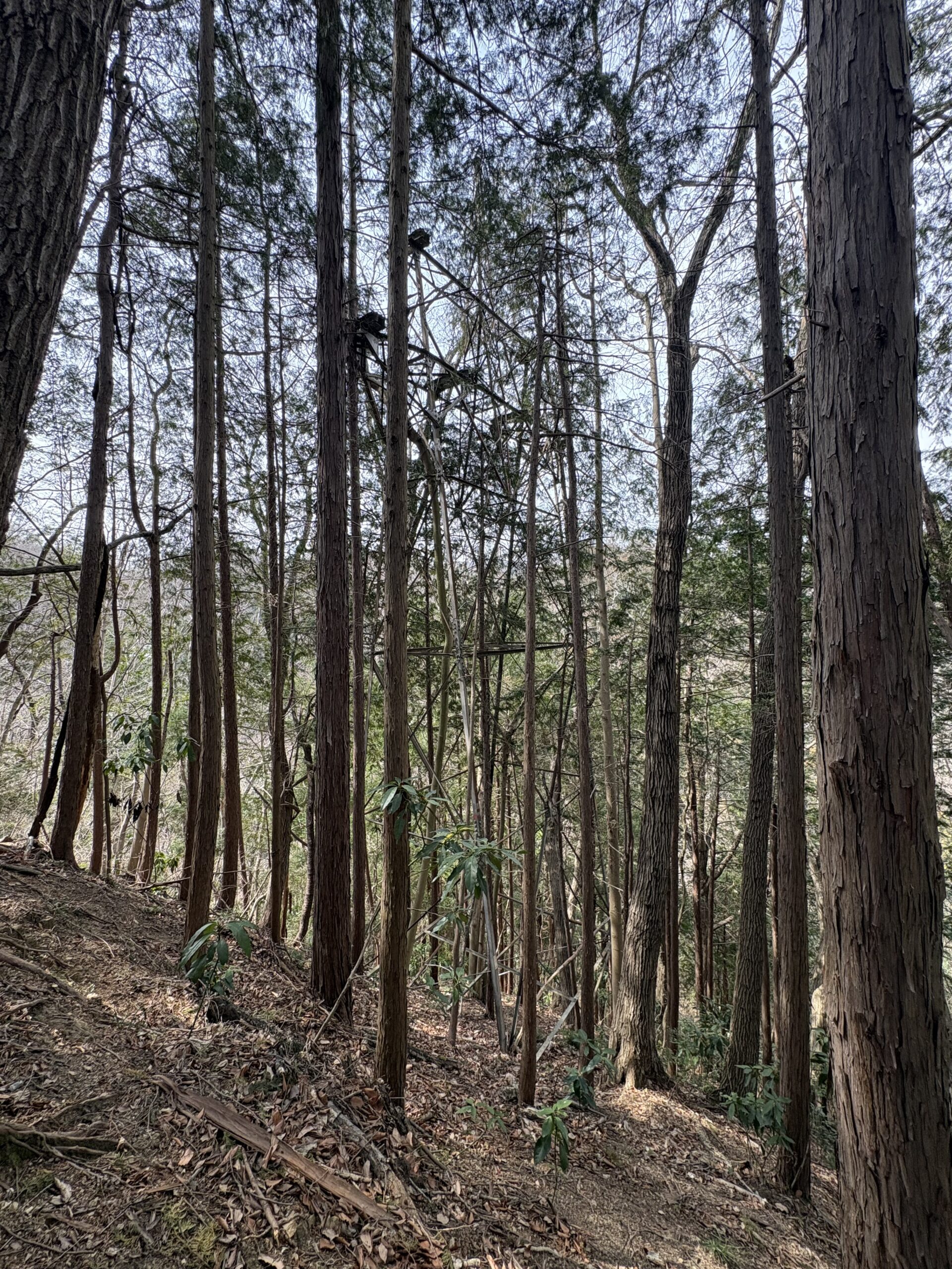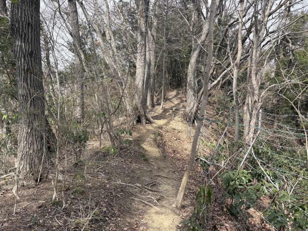 これらの鉄塔から登山道を南へ行くと分岐があります。今は高尾駅の方から来たのですが、ここで道標のない左の道へ入ります。ここは拓大西尾根といいます。このルートの東側には有刺鉄線があり、その向こうは大学の敷地となっています。