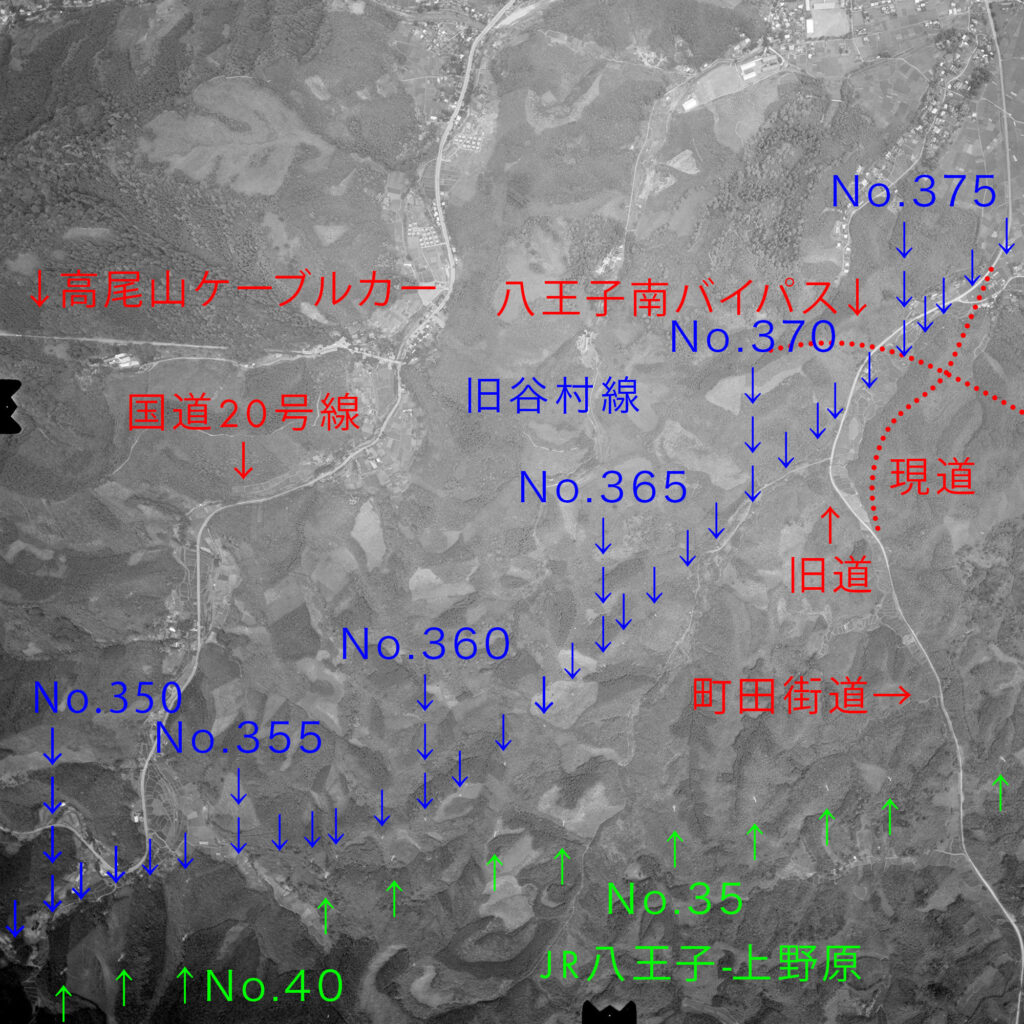 空中写真には町田街道の旧道しか写っていないので、町田街道の現道および交差する国道20号線八王子南バイパスの位置を書き足しています。写真が不鮮明なところがあるのと、枝番や欠番があった可能性があるので正確なことは分かりませんが、番号のわかっているNo.361(未見です)からカウントすると今回見てきた町田街道の旧道と新道の北側分岐から一本分岐道を挟んで南側にある鉄塔は推定No.377ということになります。ですので、別の情報が入らない限りは推定No.377とします。