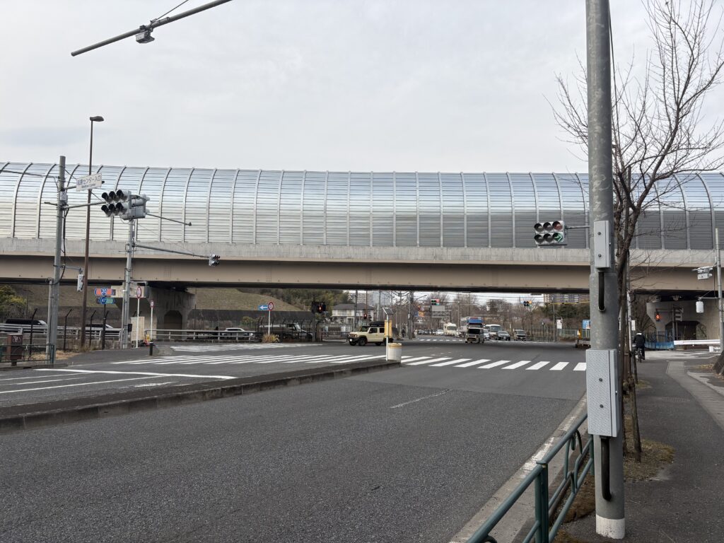 町田街道を北上していくと、医療センターの交差点で国道20号線八王子南バイパスの高架橋があらわれます。前回訪問時はこの橋はありませんでしたし、今回も形こそあるもののまだ未開通のようでした。この橋の向こうに旧谷村線鉄塔があるはずです。