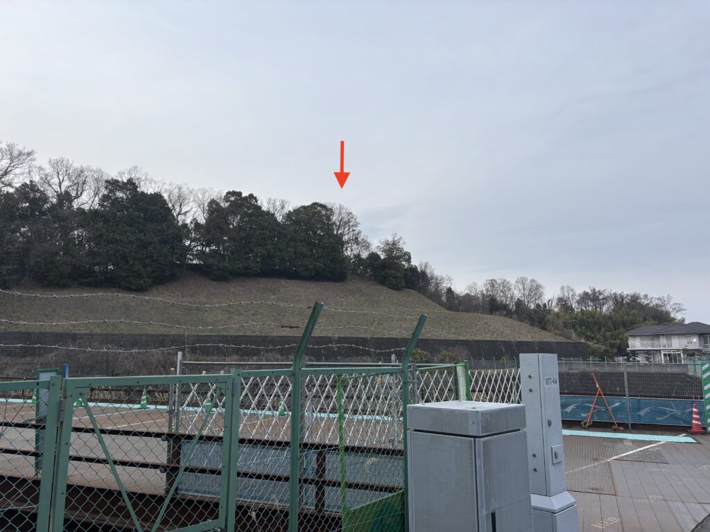 この鉄塔はさまざまな場所から見えるのも特徴です。ここまでは南東側から撮影していますが、町田街道を少し北上すると東側から見ることもできます。今まで意識していなかったのですが、この位置には扉のあるフェンスがあり、その先には階段があるので旧谷村線鉄塔のある小山の入り口はここのようです。